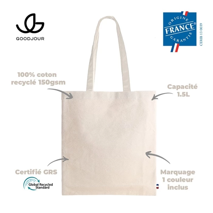 Made in France from recycled cotton, this 150gr totebag is also incredibly strong and durable.Made in France, Origine France Garantie certification, made from GRS-certified recycled materials.Made in a ESAT or Entreprise D'insertion.100% Recycled Cotton 150gr.Your totebag is certified Origine France Garantie. This is a guarantee to consumers that your totebag is made in France, according to specifications available on originefrancegarantie.fr. The certification number is: CERIB 13 0039.the aim of Origine France Garantie certification is to provide consumers with clear information on the origin of a product, and to enable companies to promote their production. To obtain this certification, Goodjour products must meet the following two criteria:- the place where the product takes its essential characteristics is located in France- at least 50% of the unit cost price is acquired in France.-