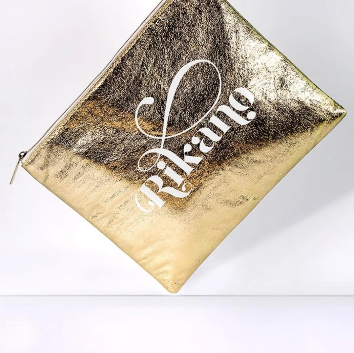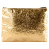 Trousse dorée, plate,en PU, de dimension 23 x 18 cm permettant d'y ranger de nombreux accessoires, avec un bel espace de marquage sérigraphie ou tampographie 1 couelur 13 x 10 cm.