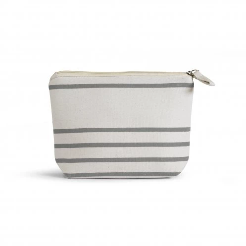 La trousse de toilette rayée, 100% coton bio 220gr/m2, vous permet de ranger vos produits cosmétiques et de maquillage.Fermeture zippée et entièrement moussée .